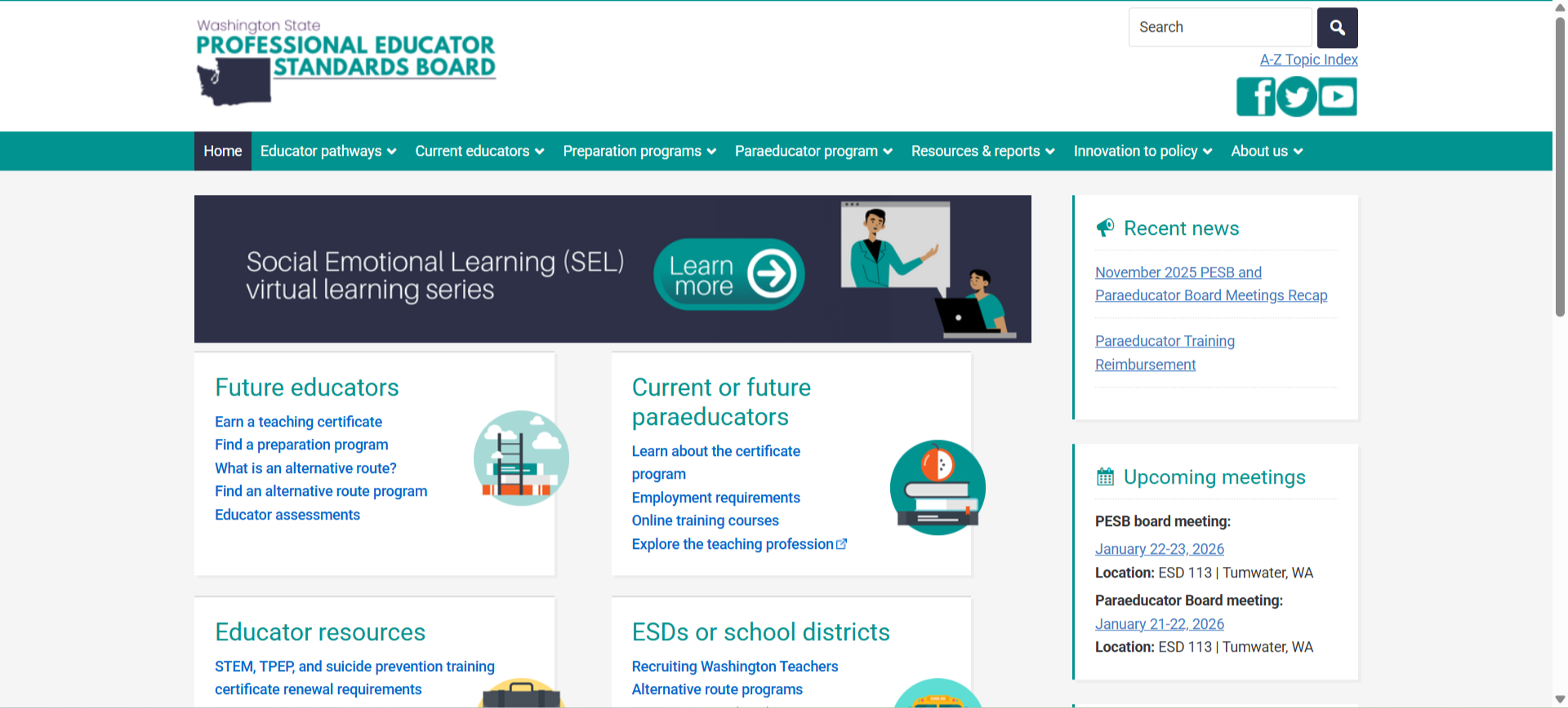 Professional Educators Standards Board is the governing body responsible for policy and oversight of Washington State’s educator certifications.